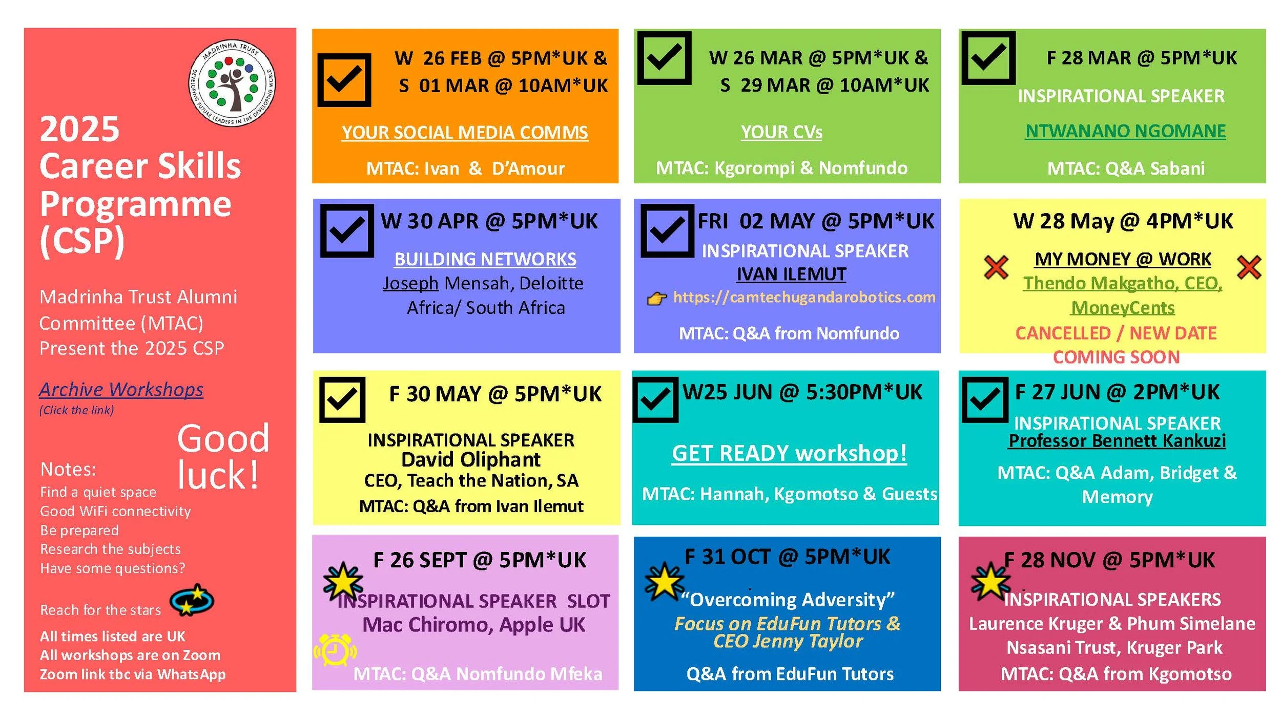 Madrinha Trust’s Career Skills Programme (CSP) is starting its 5th year of career focused workshops with a brand new programme of inspirational speakers and workshops, starting in January and completing in July 2025.